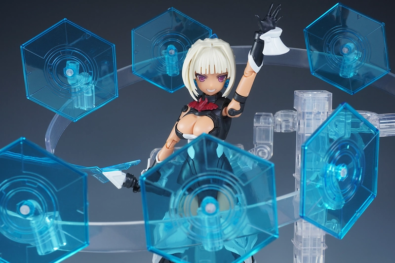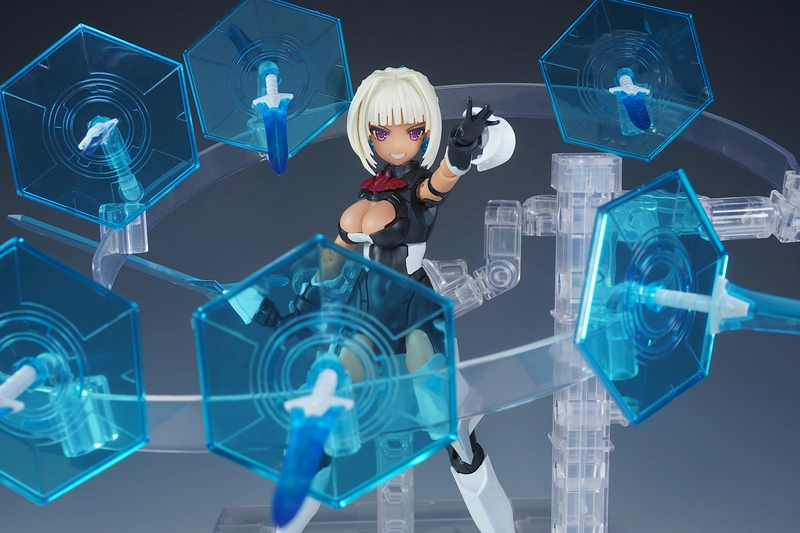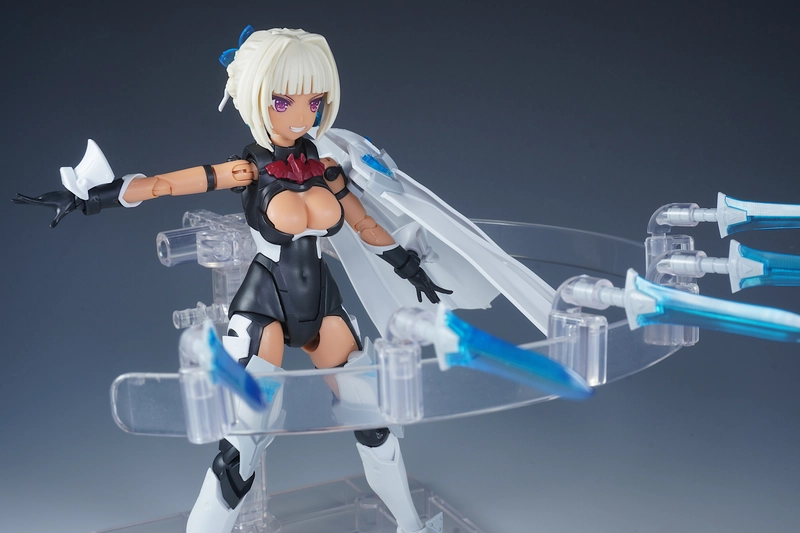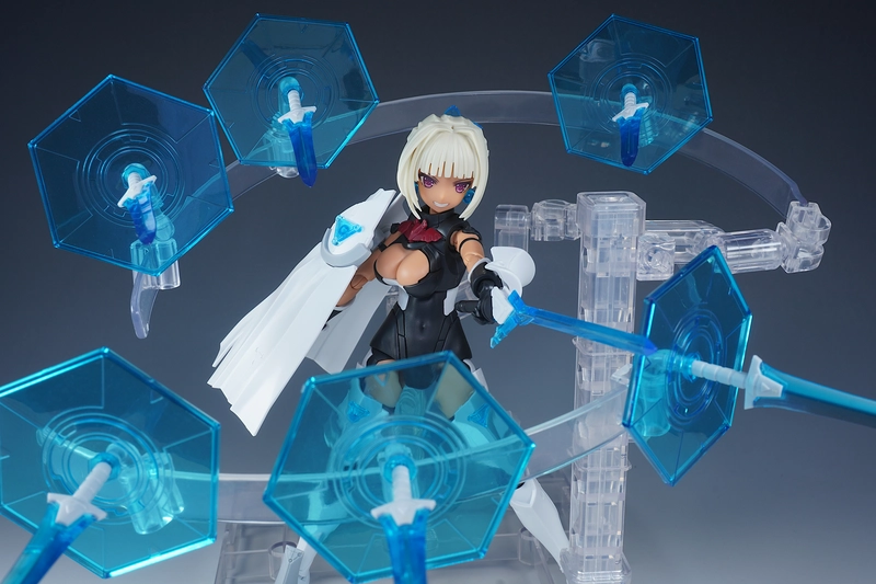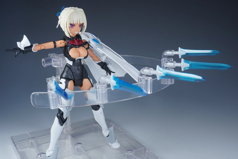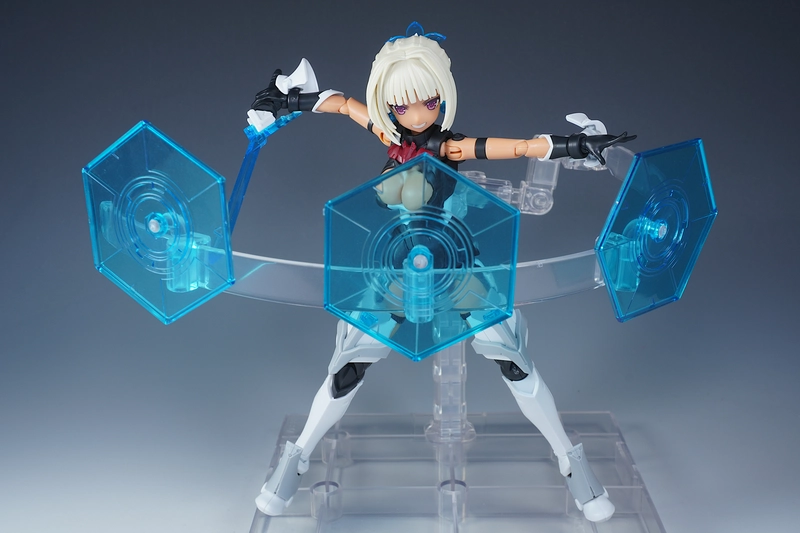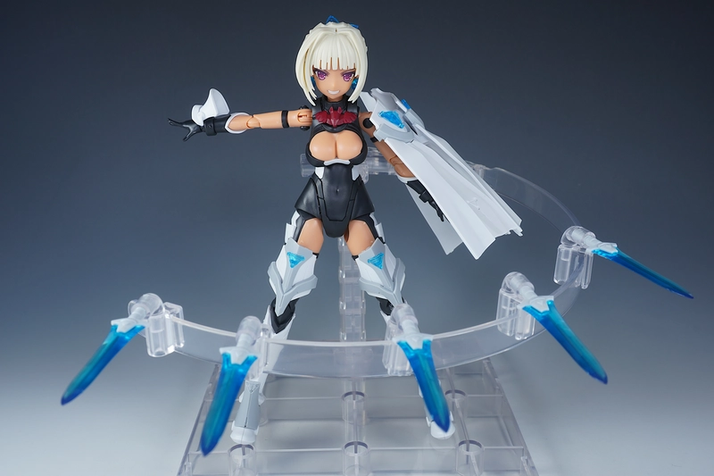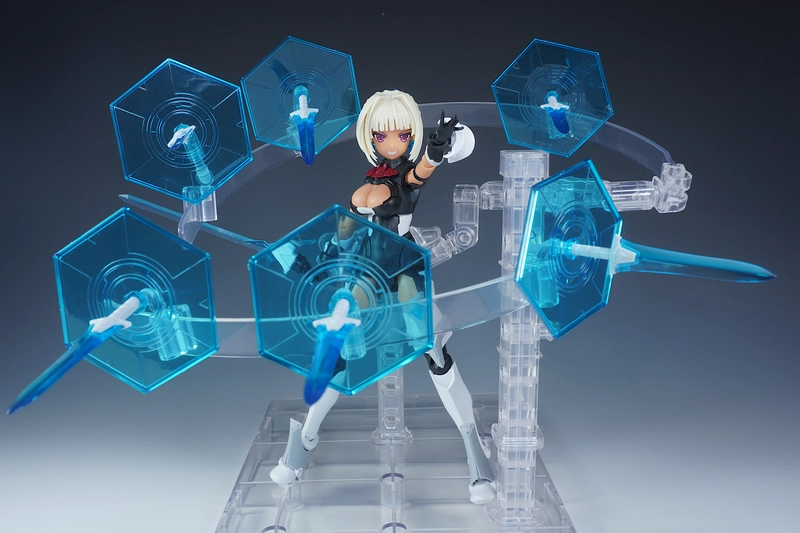 使っているベースは、コトブキヤから出てるプレイングベースAです。今回のように多くの武装などを浮かせたい時はこれで決まり!